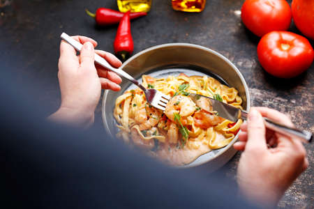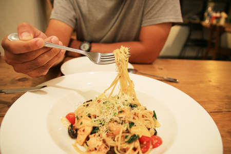 detail male hand eating pasta spaghetti with clams and mullet, Mediterranean food