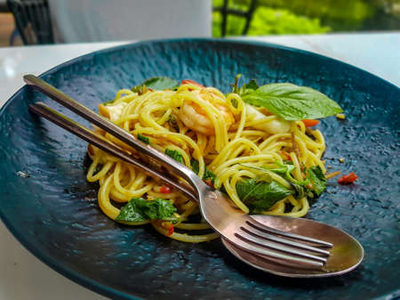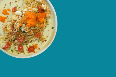 fusion food style , Cream sauce spaghetti egg shrimp on blue background
