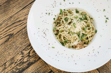 Close up spaghetti carbonara italian pasta served on white plate with parsley in the restaurant