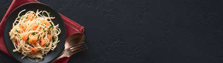 Spaghetti shrimp scampi in a plate banner with free space for text.