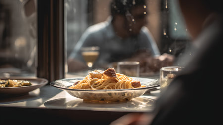 Realistic pasta restaurant with cozy atmosphere neutral colors warm lighting high level of detail and no people in a long shot. Generative AI Generated