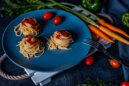 deep white plate with spaghetti pasta, with tomatoes, peppers, sprinkled with cheese, Italian pasta dish, typical Italian cuisine, carbohydrate plate