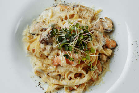 Plate of italian pasta fettuccine with cream sauce and herbs