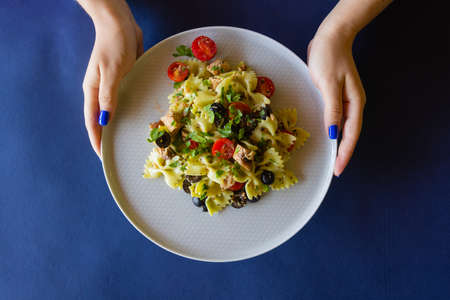 nourishing and healthy pasta, macaroni with colorful and tasty vegetables and capers