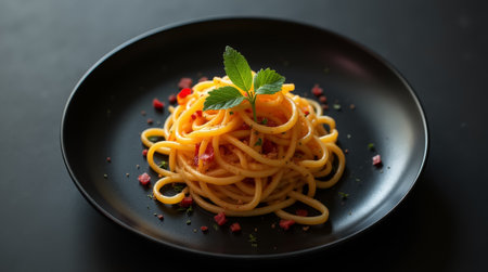 Spaghetti is artistically placed on a black plate, garnished with herbs and bits of meat, creating an enticing dish perfect for pasta lovers at dinner.