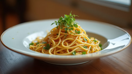 A plate of perfectly cooked spaghetti is garnished with fresh herbs, presented elegantly in a inviting restaurant setting during the lunch hour.