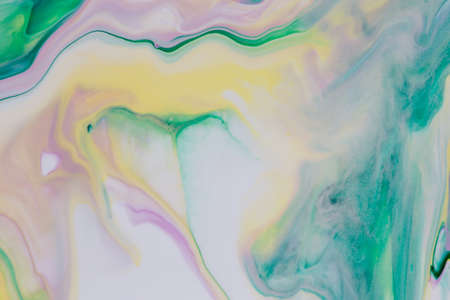Multicolored lines and spots on liquid surface. Abstract background made with fluid art technique. Trendy colorful backdrop. Fluid art