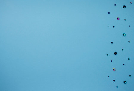Multicolored rhinestones on blue background, top photo. Design for text