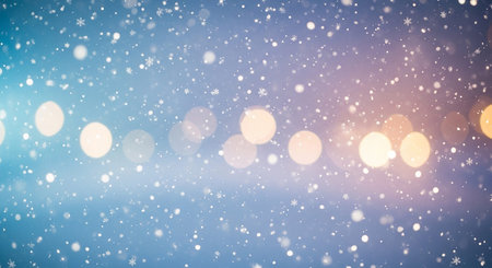 Colorful bokeh lights and falling snowflakes create a festive, blurred winter atmosphere against a dark backdrop.