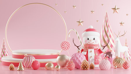 A delightful winter scene showcasing a charming snowman beside a pink tree and shiny ornaments, creating a cozy and festive atmosphere perfect for holiday celebrations.