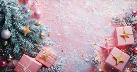 A beautiful arrangement featuring pink presents adorned with gold ribbons, surrounded by pine branches, ornaments, and decorative stars, creating a festive atmosphere suitable for holiday celebrations.