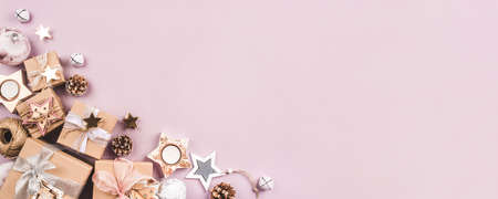 Christmas composition. Gift box Christmas decorations copy space with for your text. Flat lay.Banner