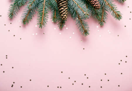 Christmas natural coniferous border with cones and confetti on pink background