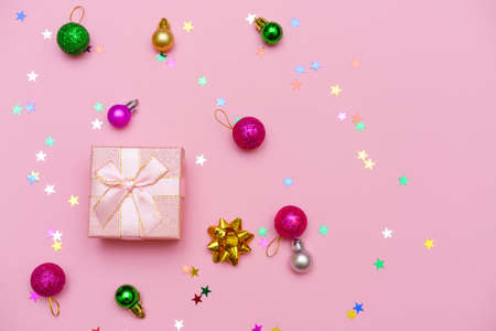 New years composition. Colored decoration balls and stars on pastel pink background. Christmas winter, new year concept. Flat lay, top view, copy space