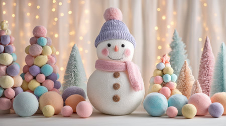 A charming winter scene featuring a cheerful snowman surrounded by colorful pom poms and lovely pastel trees, creating a delightful festive atmosphere perfect for the holidays.