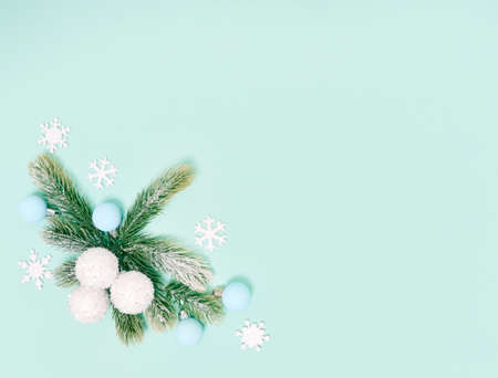 Christmas flat lay, banner. A composition of spruce branches of shiny white balls on a blue background. Winter holiday design copy space, top view. The concept of Christmas, New Year, winter mood.