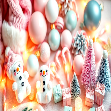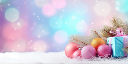 A selection of Christmas ornaments in gentle pastel colors such as pink, blue, gold, white, and teal are placed on a fluffy white surface resembling snow. The ornaments a smooth, matte finish, exuding a soft and aesthetic. The background is softly blurred with a bokeh effect of warm, glowing lights, creating a festive and inviting atmosphere holiday themes.