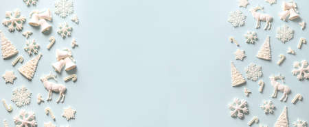 Christmas background. Top view of Christmas decorations. Flat lay of creative design on blue background. Copy space for text.