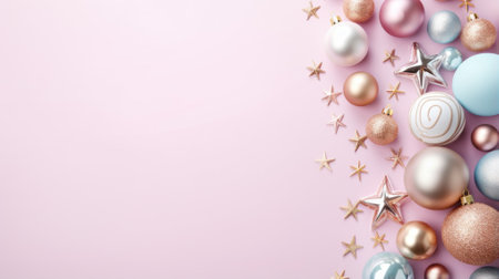 A festive arrangement of pastel-colored Christmas ornaments and decorations on a pink background, offering ample copy space.
