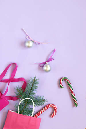 Merry Christmas, lilac background with Christmas decor, gift wrap, caramel sticks and space for an inscription, top view