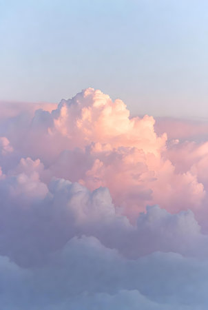 Cloudscape showing soft pastel pink and purple clouds illuminated by golden sunlight against a pale blue sky at dawn or dusk keywords: clouds, sky, pastel, pink,...