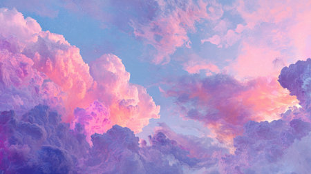 Beautiful view of pink clouds in vibrant sunset sky. Clouds are fluffy and full of light, creating stunning visual display. Dramatic unreal sky with cumulus and stratus clouds in atmosphere. AI art.