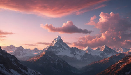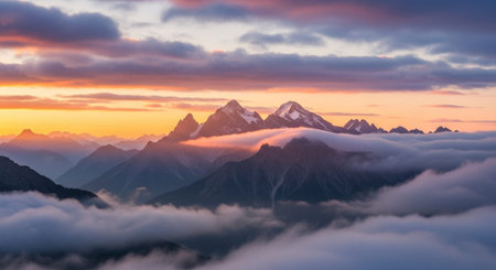 Witness the breathtaking beauty of a majestic sunrise casting vibrant colors across a dramatic mountain landscape. Soft clouds layer the horizon, creating a serene atmosphere perfect for nature lovers and adventure seekers alike.