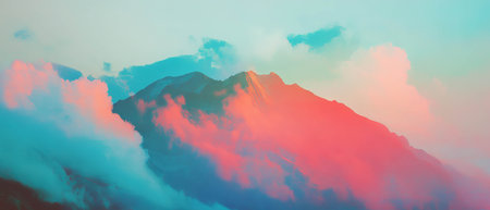 A striking image showcases a mountain peak piercing through dense, flowing clouds. The sky displays a gradient of vibrant colors, shifting from soft pinks and purples to a gentle turquoise. The composition utilizes atmospheric perspective to create depth, enhancing the sense of elevation and natural beauty. Suitable for various editorial and commercial applications.