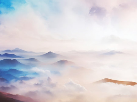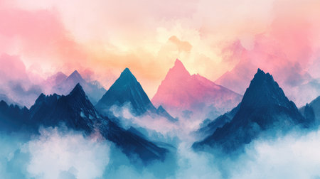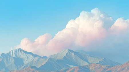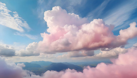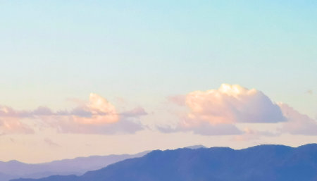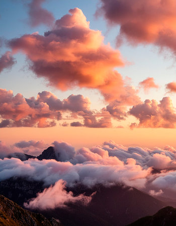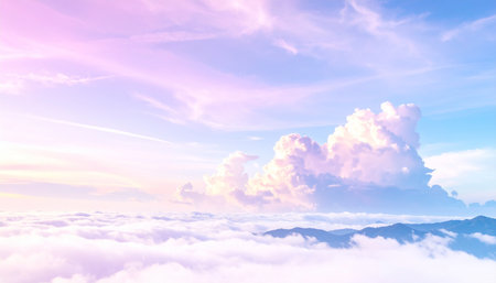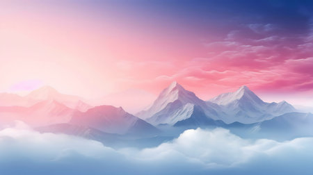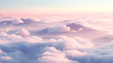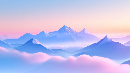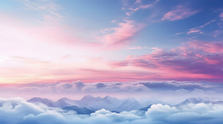 An enchanting view of soft pastel clouds blending with mountains at twilight, showcasing a beautiful gradient of colors that evokes tranquility and serenity.