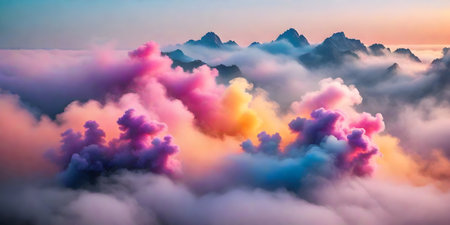 Majestic mountain peaks enveloped in ethereal, colorful clouds at dawn