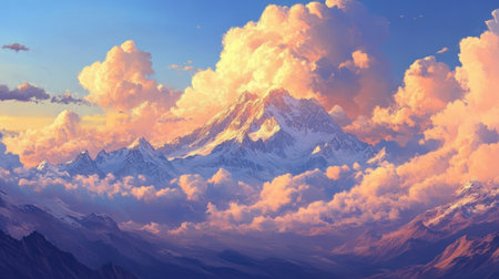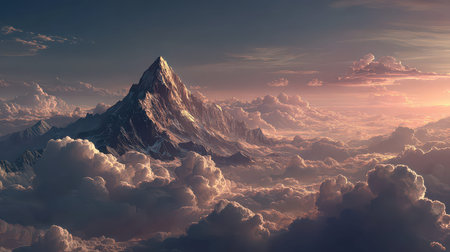 A breathtaking view of a majestic mountain peak soaring above soft clouds during sunset. The scene captures dramatic lighting and serene beauty, perfect for nature lovers.