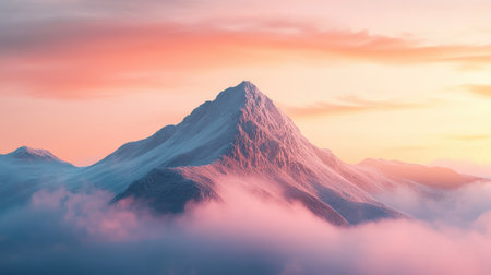 Mountain peak rising above clouds under colorful pastel sky at sunrise. Mist and sunlight create dreamy, tranquil and uplifting scenery.
