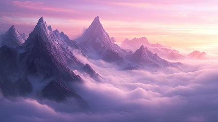 Majestic mountain peak surrounded by clouds, showcasing vibrant purple and pink hues in sky. breathtaking view that evokes sense of wonder and tranquility.