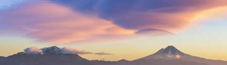Panoramic view of Himalaya mountains in clouds at sunset.