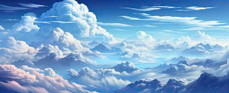 A beautiful blue sky with fluffy clouds and a mountain range in the background. The sky is filled with stars, giving the image a serene and peaceful atmosphere
