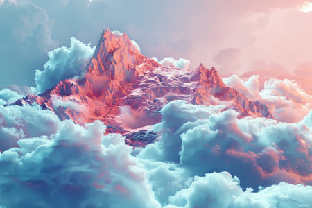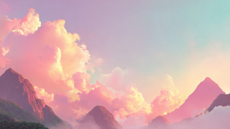 A stunning fantasy landscape showcases soft pastel-colored clouds and tall peaks, creating a serene atmosphere perfect for evoking feelings of awe and tranquility.