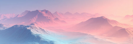 This digital artwork presents a breathtaking panoramic view of layered mountain ranges bathed in the soft, pastel hues of sunrise. The ethereal gradients of pink and purple evoke a tranquil, serene atmosphere, perfect for backgrounds or themes exploring nature's quiet beauty.