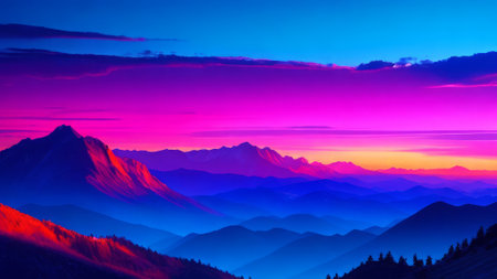 Breathtaking mountain landscape at sunrise, showcasing layered peaks and a vibrant gradient sky. Ideal for nature lovers and adventure seekers.