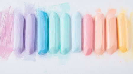 Soft pastel chalks in purple to yellow hues are neatly arranged on a white surface creating a lovely gradient effect.