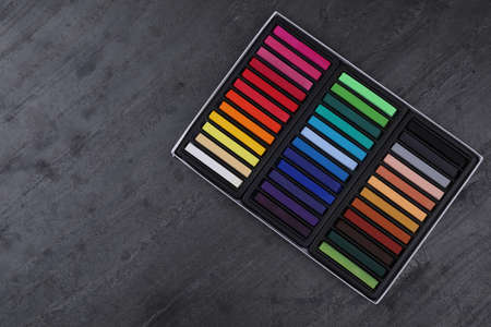 Set of colorful pastels in box on gray stone table, top view with space for text. Drawing materials