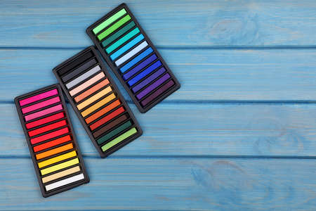 Colorful pastels in trays on light blue wooden table, flat lay with space for text. Drawing materials