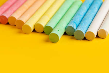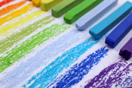 Colorful pastel chalks on white background, closeup. Drawing materials