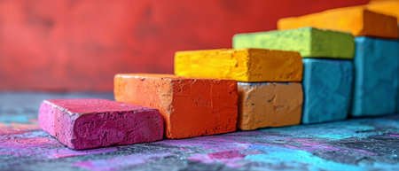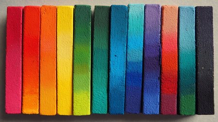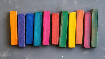 Neatly aligned rainbow-colored chalk on clean surface, bright and cheerful composition