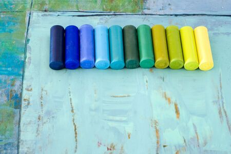A minimalist composition of vibrant chalk pastels neatly arranged on a gray background.