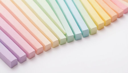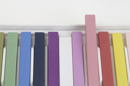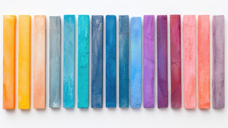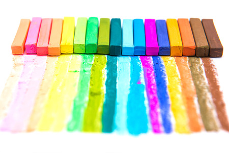 Colorful chalk pastels in an Up and Down Pattern, on white background, arranged as rainbow spectrum