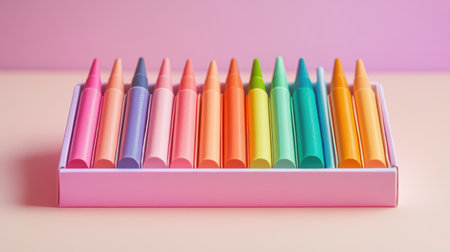 A vibrant arrangement of colorful crayons displayed in a neat box against a soft pastel backdrop. Perfect for artistic projects and educational purposes.