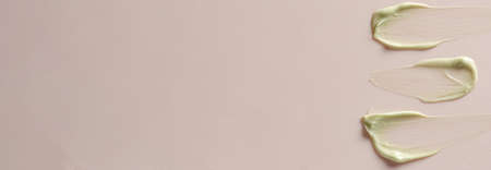 Facial Highlighter swatch on nude background close up, copy space. Light facial cream sample.