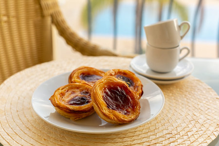 Portuguese summer breakfast. Pastel de nata and coffee. Portuguese egg custard tart pastry.