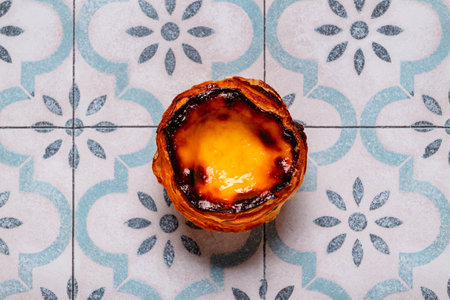 Egg tart, traditional Portuguese dessert, pastel de nata. Azulejo tile background.