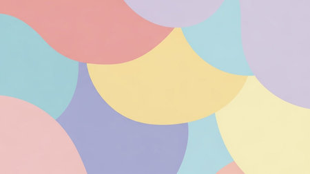 A collection of circular shapes in muted pastel colors like lavender, pink, and mint green are artfully scattered across a light beige surface